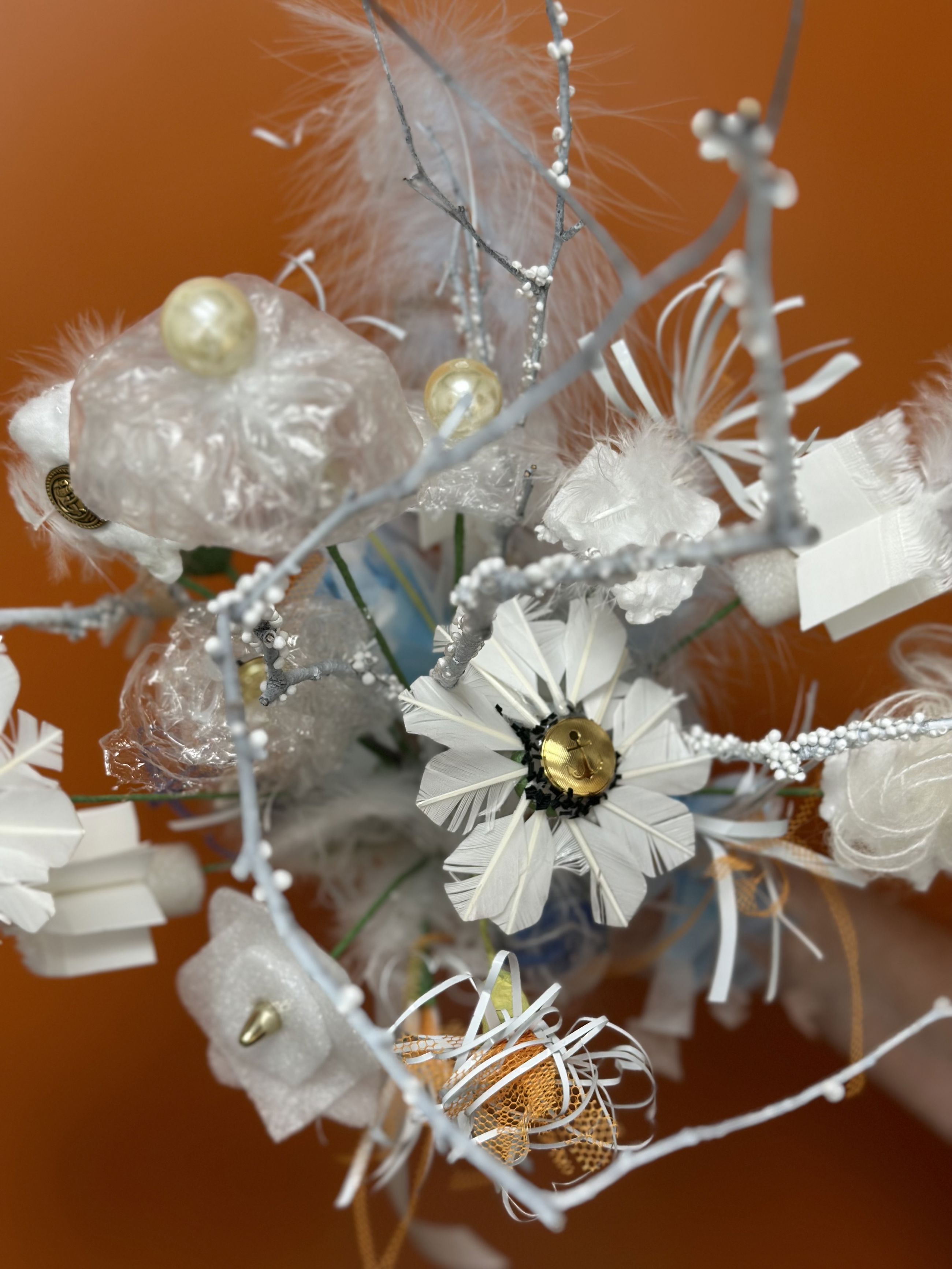 Materialerne, der er blevet brugt til buketten, er af alt fra mundbind og persienner, champagnepropper og fjerbolde til bånd og stof og nedfaldne grene fra træer.